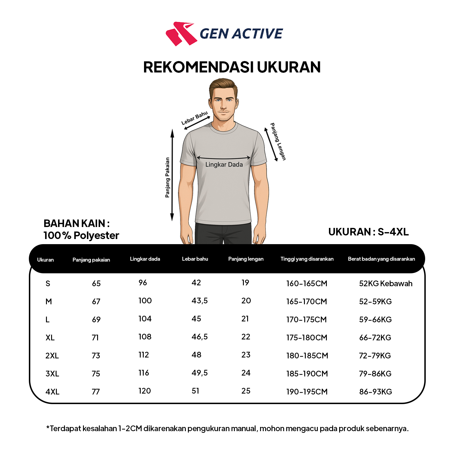 GEN ACTIVE Kaos Olahraga Pria Dry Fit Baju Lari Gym Fitness Running Bahan Breathable Quickdry adalah kaos olahraga lengan pendek yang terbuat dari bahan 100% POLYESTER yang ringan dan mampu menyerap keringat dengan baik. Didesain untuk kenyamanan maksimal,sangat ringat, anti kusut dan gampang kering, karena untuk menciptakan rasa nyaman saat digunakan ngegym maupun olahraga lainnya, kaos ini memiliki tekstur breathable yang menjaga tubuh tetap sejuk dan kering, serta potongan fit yang fleksibel mengikuti gerakan tubuh supaya tetap nyaman saat digunakan.